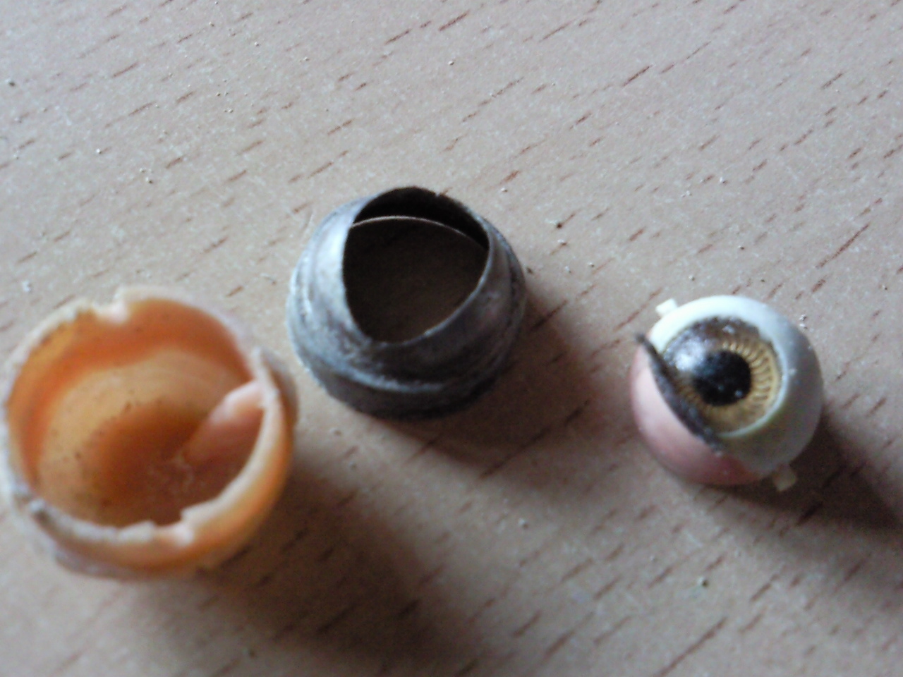 Los ojos estaban bastante sucios. Ademas tenia los iris pintados con barniz brillante o esmalte de uñas transparente, por lo que he tenido que pulir todo muy bien y sacarle brillo.